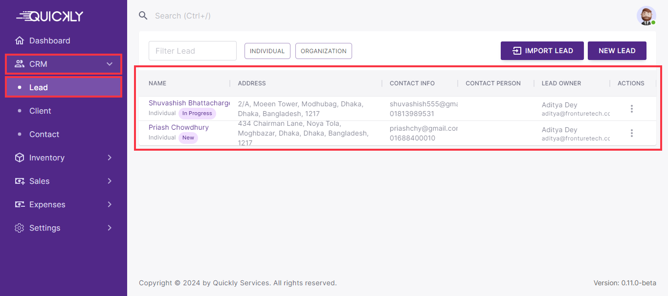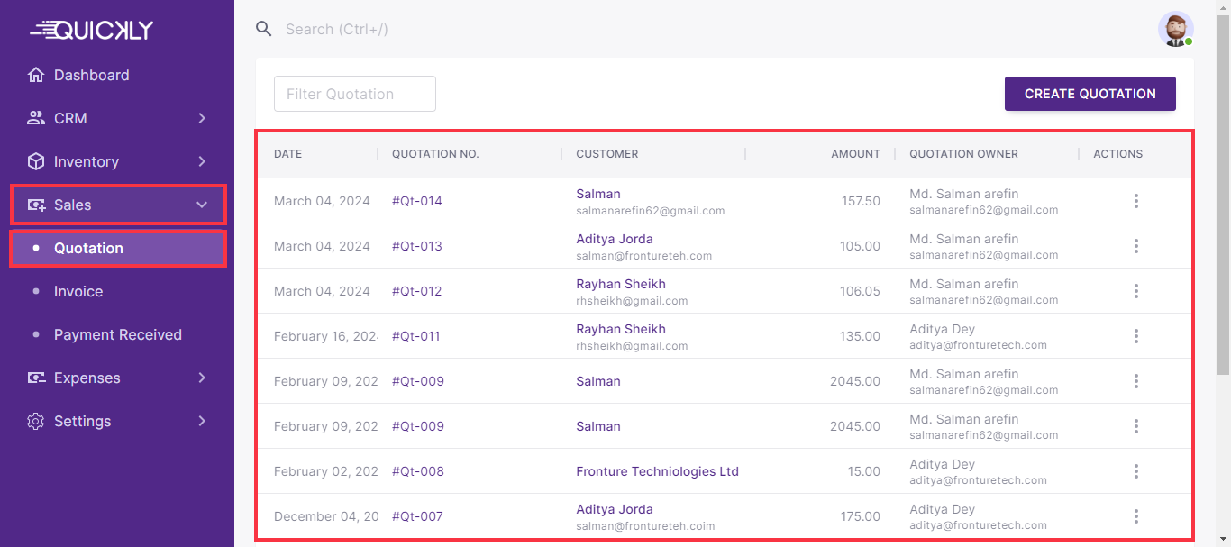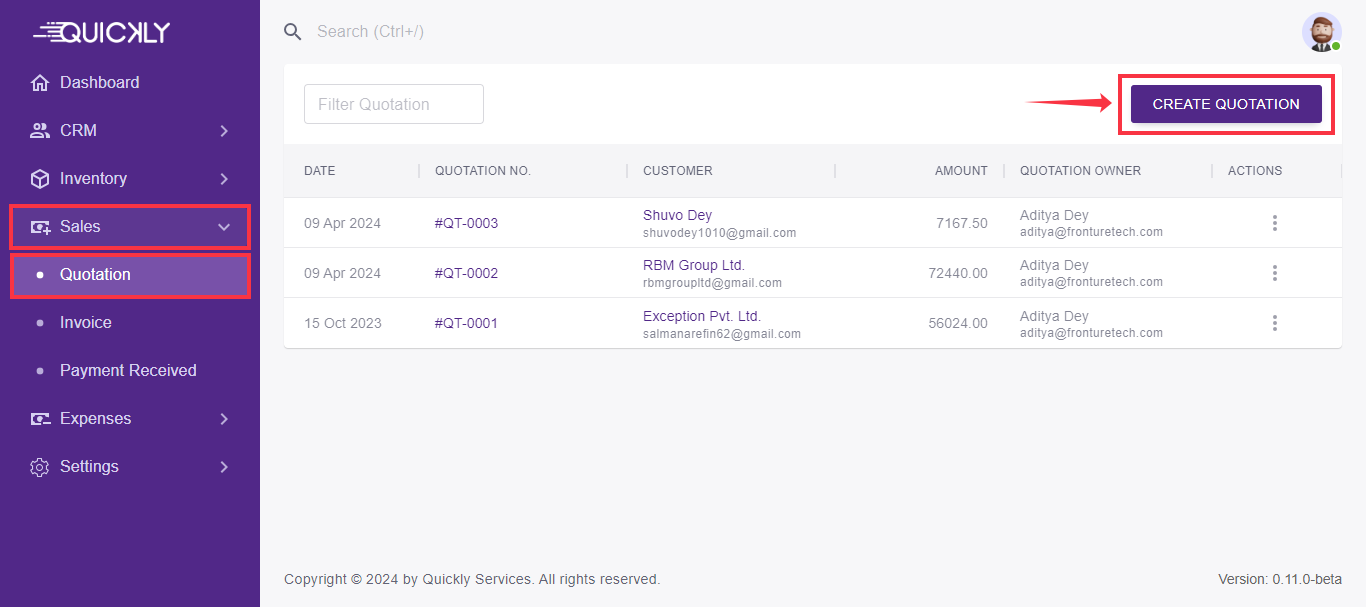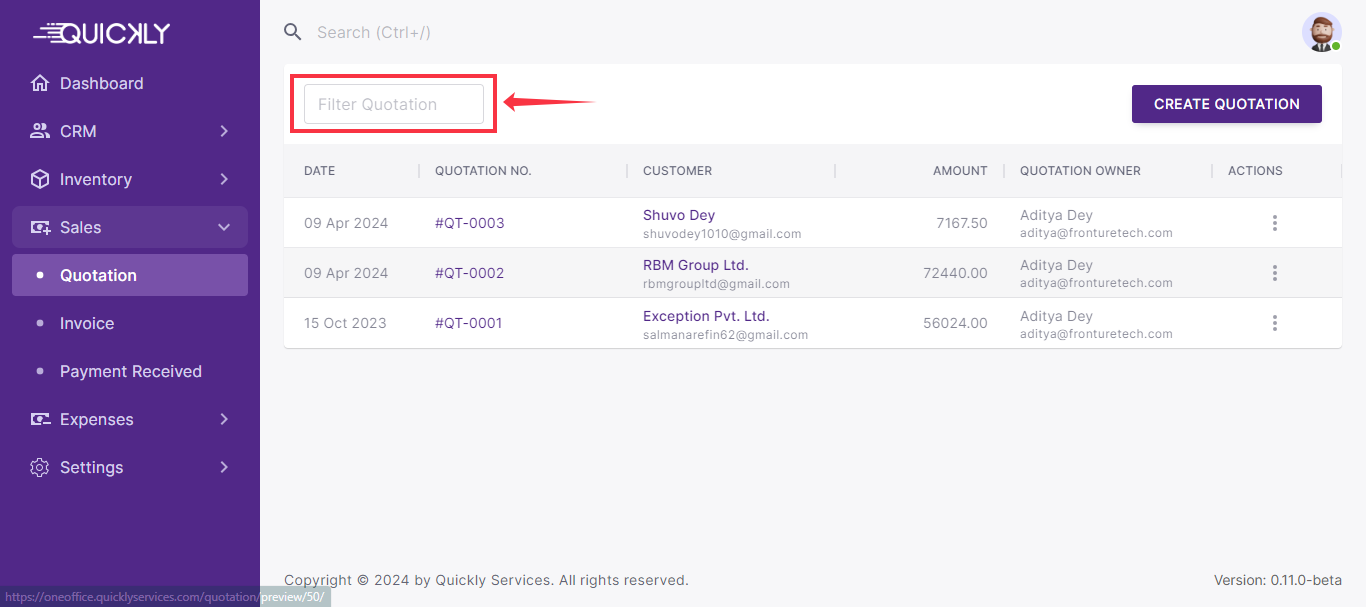 All the created quotations can be viewed on the Quotation page under Sales section. -