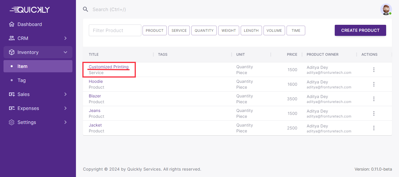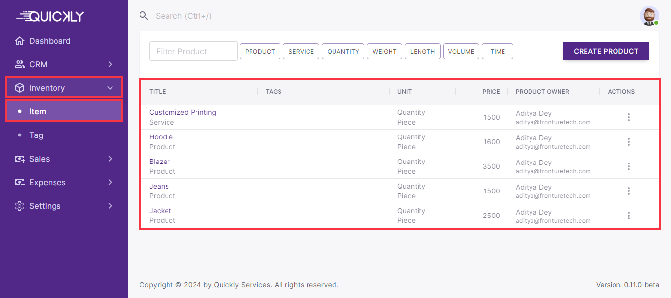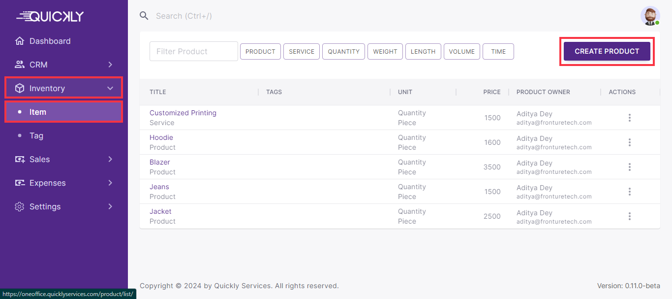 To add a new item, go to Item under the Inventory section from the Navigation Menu and click on Create Product.