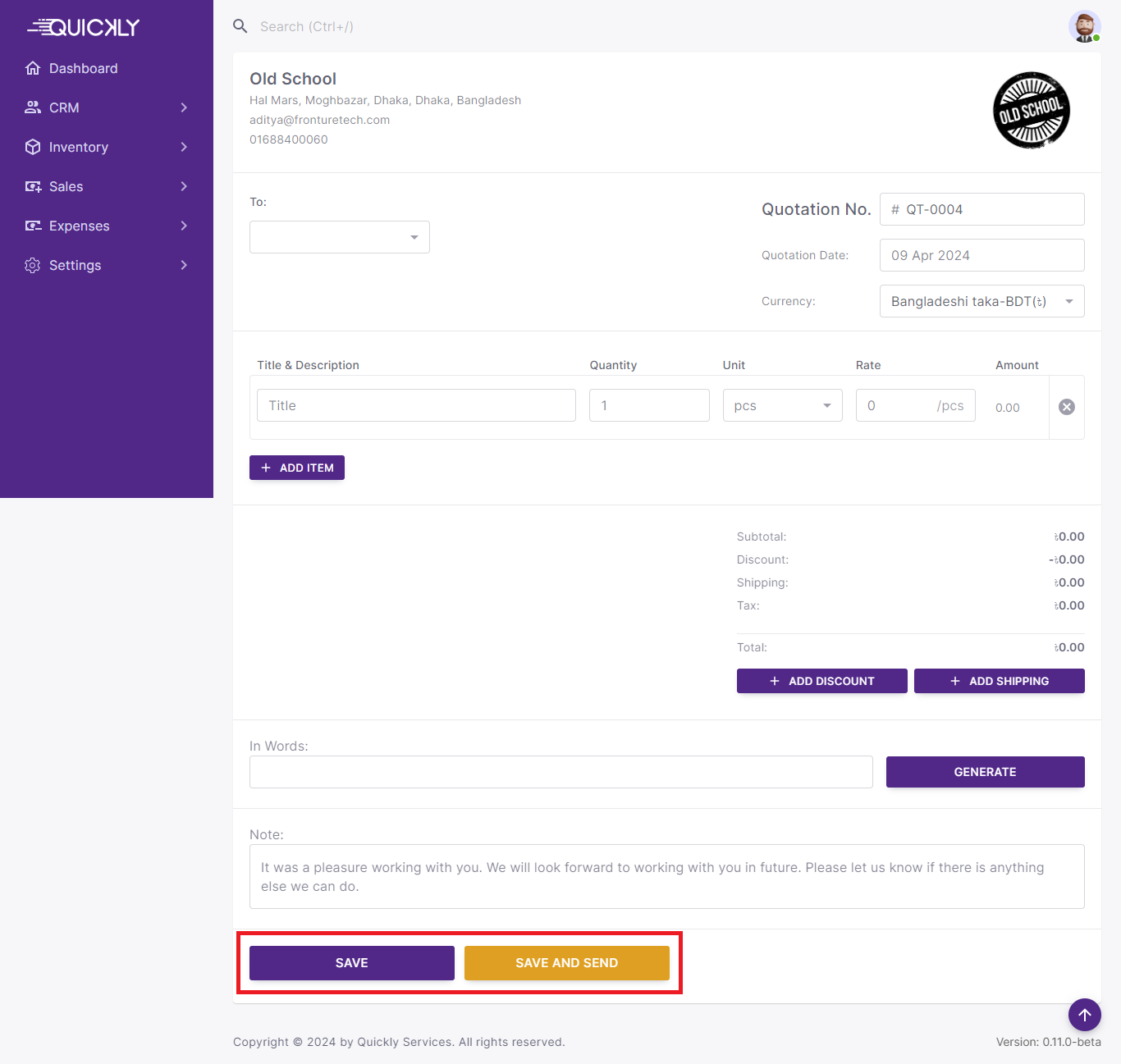 Input all necessary information for the quotation and click on Save. Besides, you can save and send the quotation via mail at the same time.