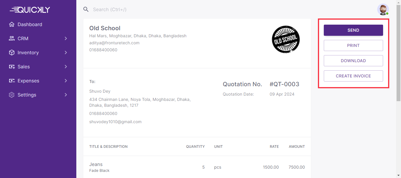 From the Quotation preview page, you can Send Quotation via email, Print & Download quotation and Create Invoice against that quotation.