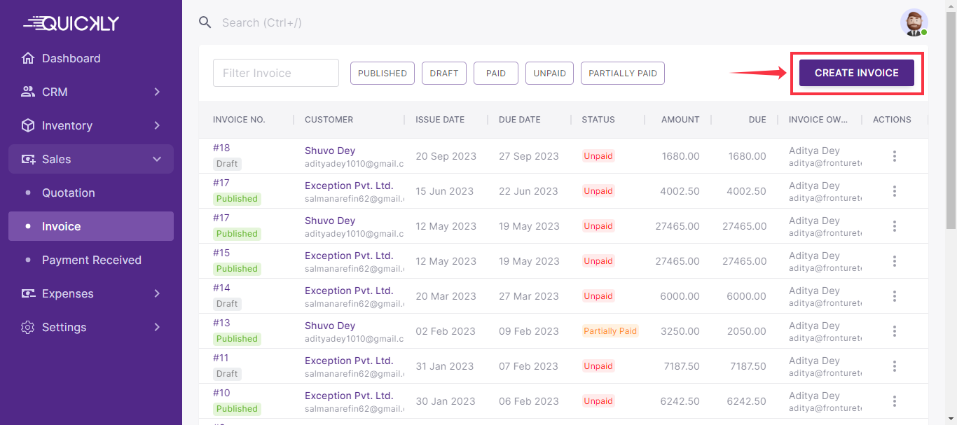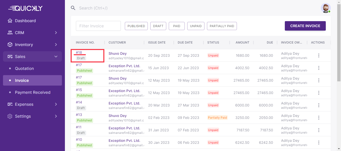 All the created invoices can be viewed on the Invoice page under the Sales section. -
