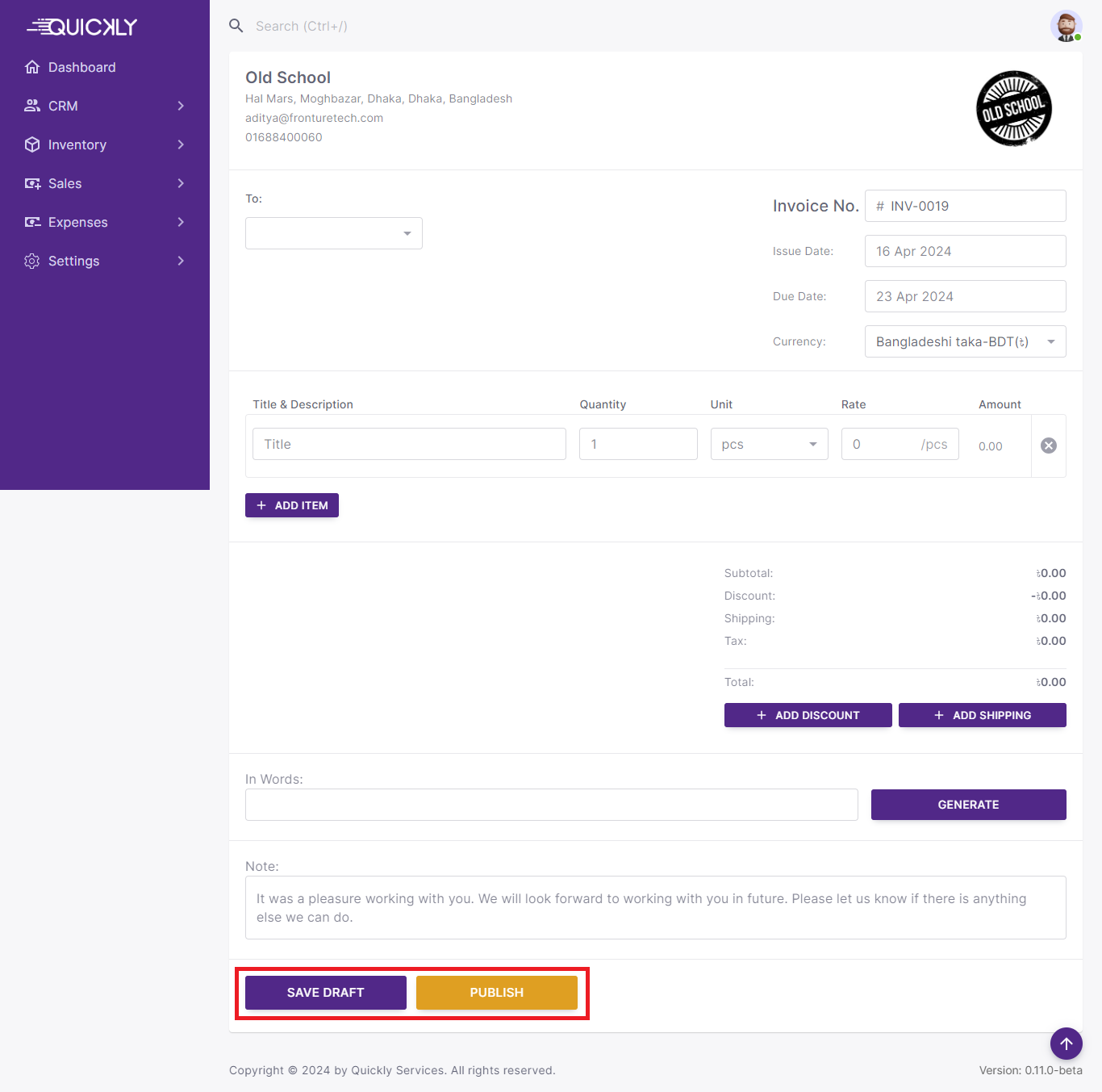 Input all necessary information for the invoice and click on Save Draft. Besides, you can Publish the invoice at the same time from the invoice creation page.