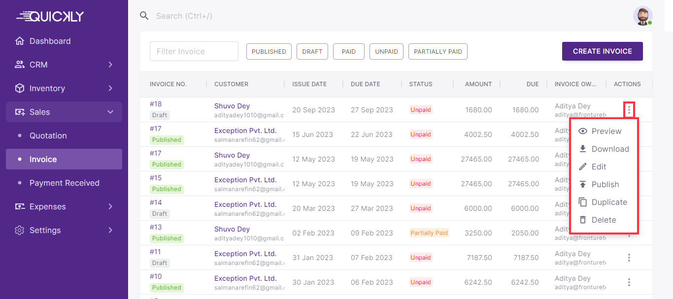 You can Preview, Download, Edit, Publish, Duplicate, or Delete an invoice from the 3 dot menu located in the Actions field.