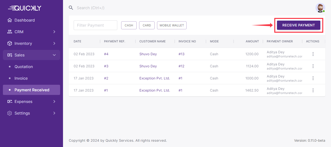 To create a new payment, go to Payment Received under the Sales section from the navigation menu and click on Receive Payment.