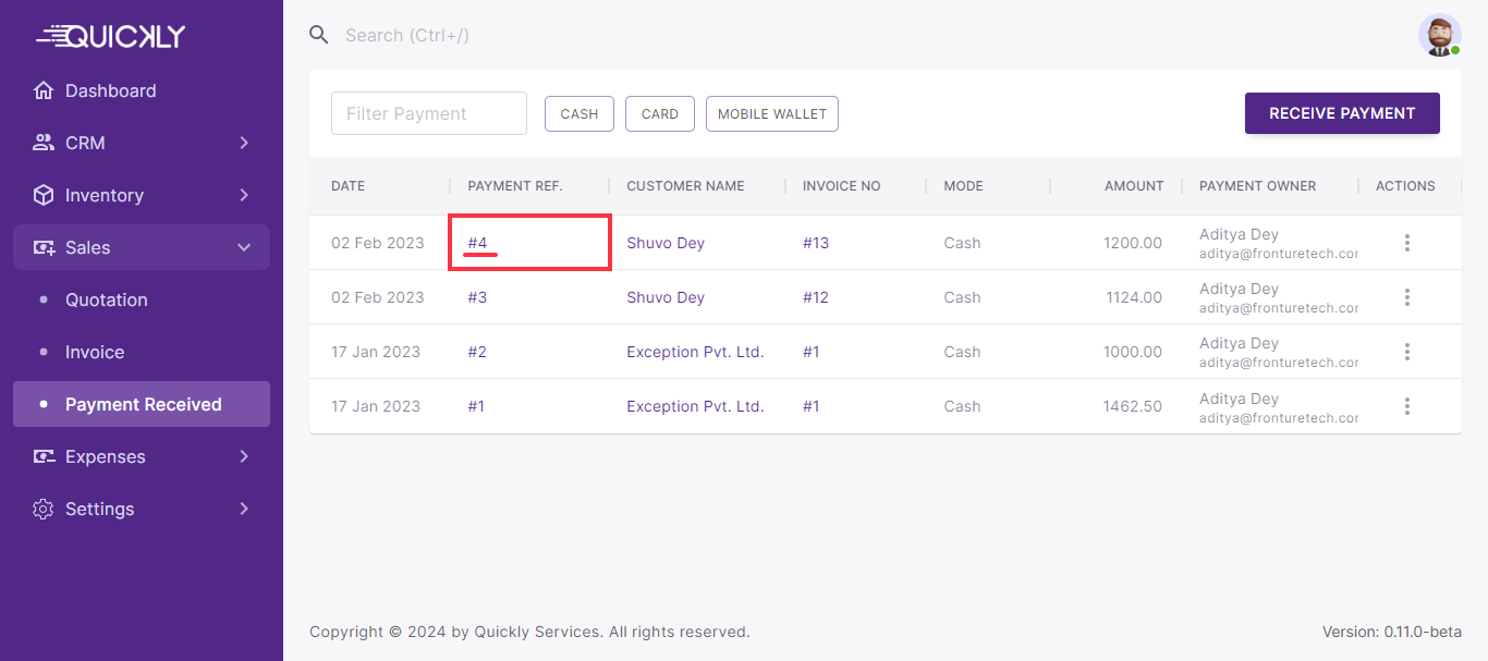 You can see the Payment Date, Payment Reference Number, Customer info, Invoice Number against which the payment is received, Payment Mode, Payment Amount, and Payment Owner from the Payment Received page. -