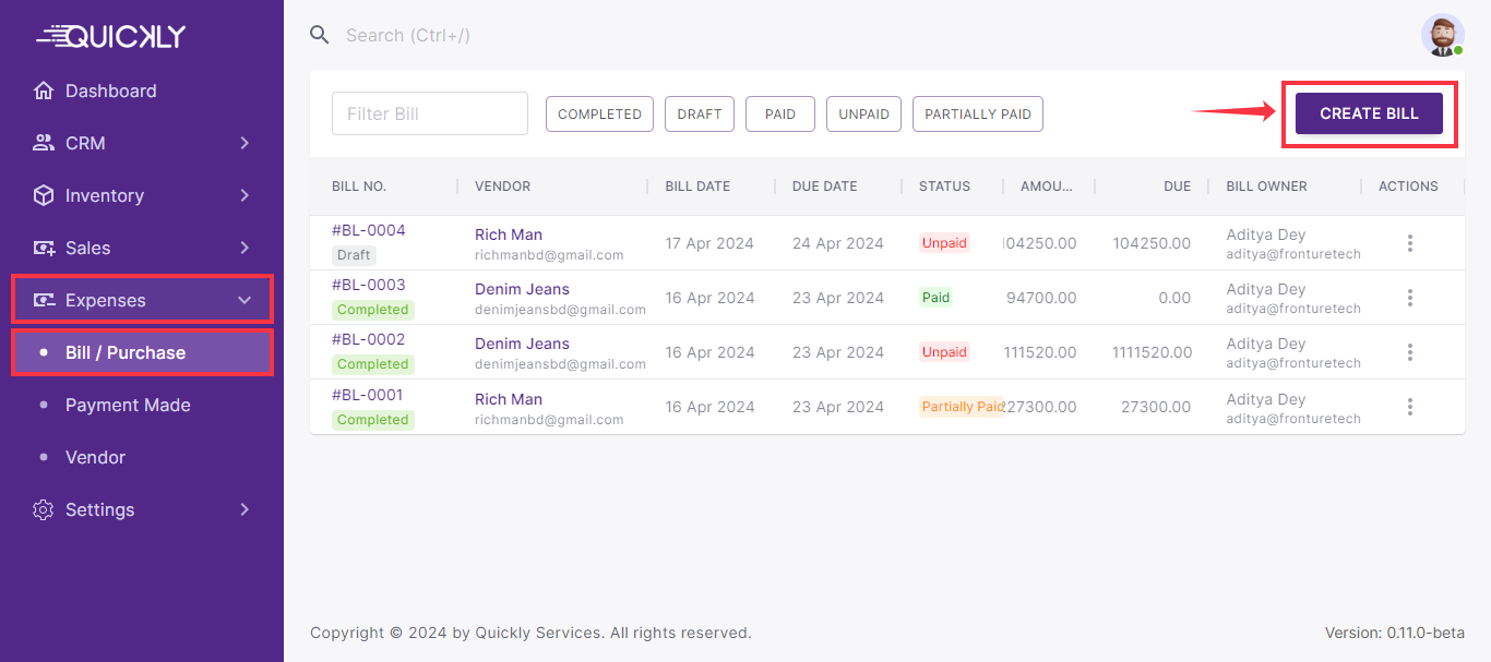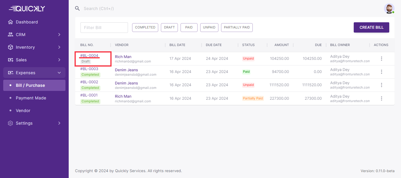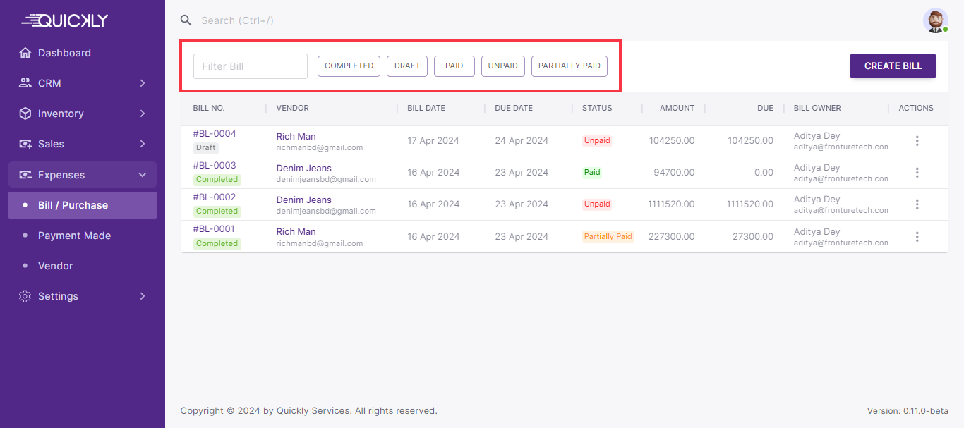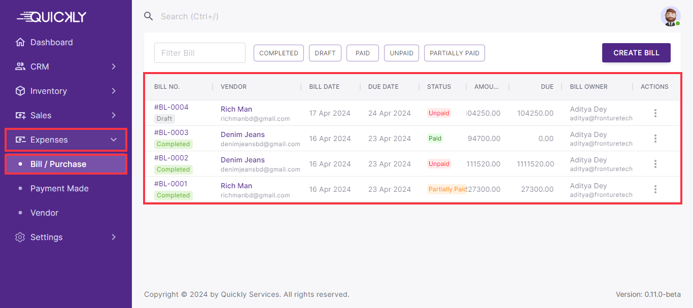 You can see Bill Number, Vendor details, Bill Creation Date, Bill Due Date, Payment Status, Total Amount, Due Amount and Bill Owner info from the Bill / Purchase page. -