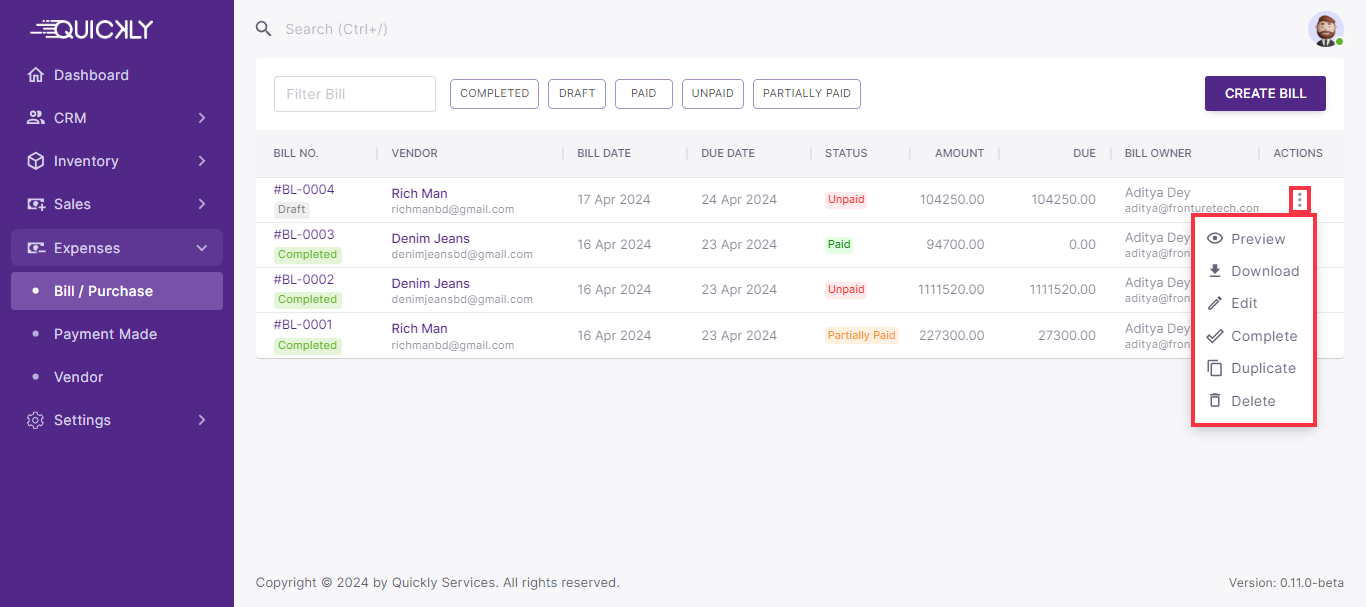 You can Preview, Download, Edit, Complete, Duplicate, or Delete a bill when it is drafted from the 3 dot menu