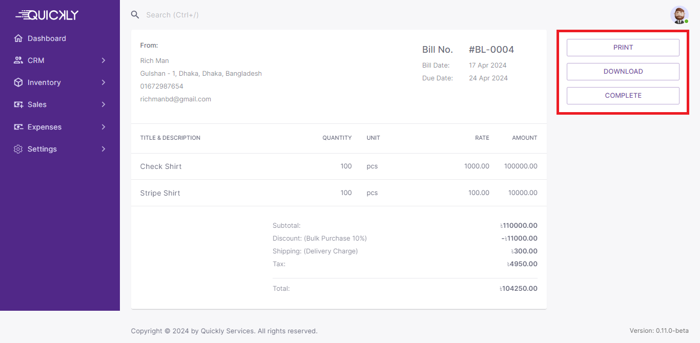 From the Bill preview page, you can Print & Download bill and Complete the bill if it is drafted