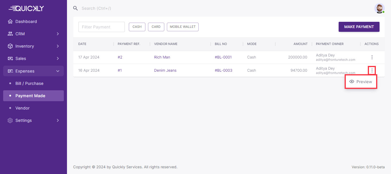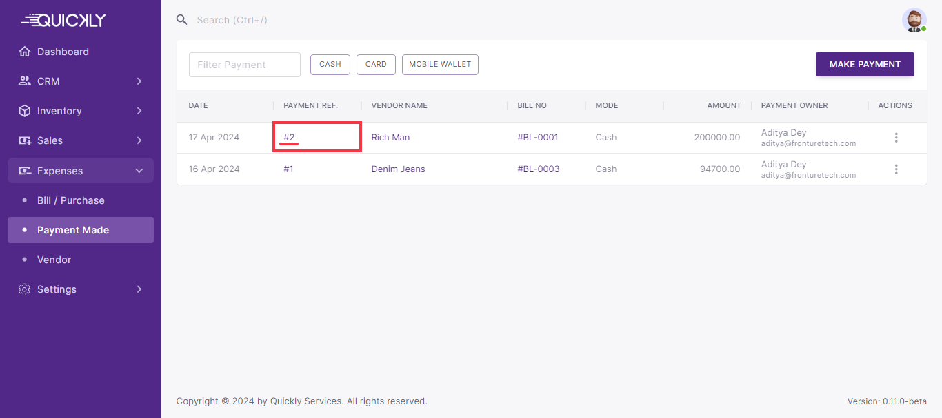 You can see the Payment Date, Payment Reference Number, Vendor info, Bill Number against which the payment is made, Payment Mode, Payment Amount, and Payment Owner from the Payment Made page. -