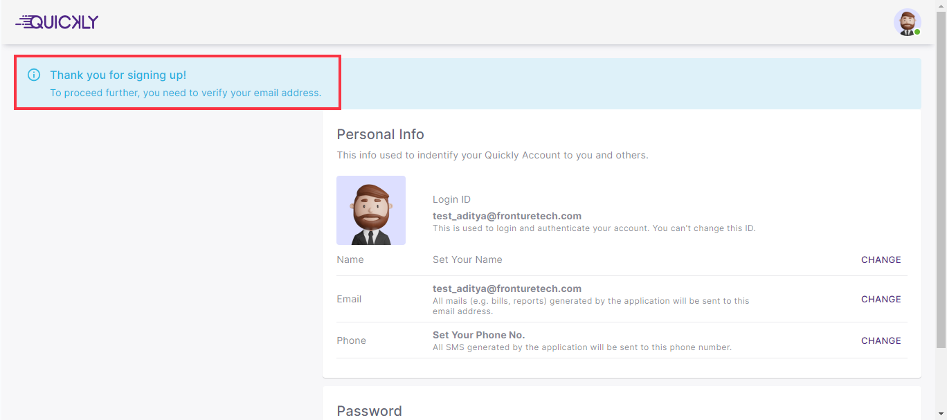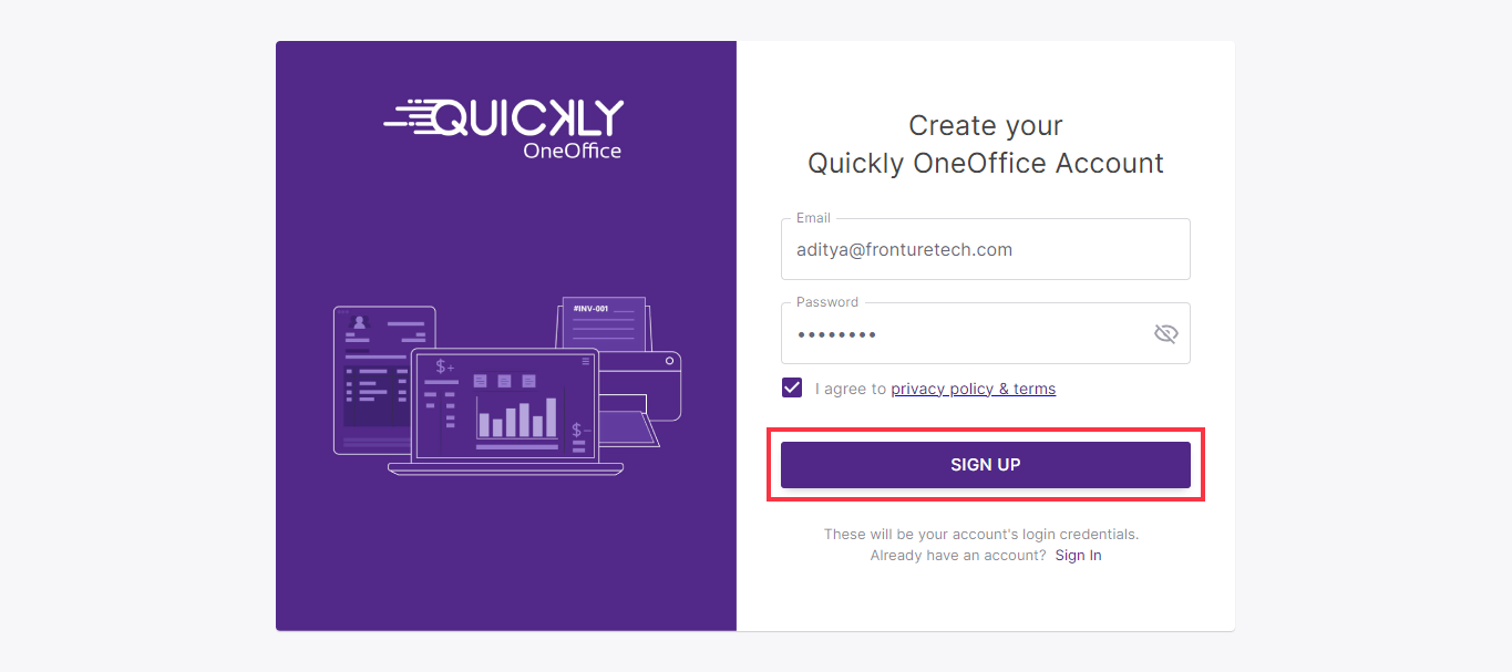 The user will receive an invitation via email. If the invited user does not have a Quickly OneOffice account, he will be taken to the Sign Up page right after he accepts the invitation. Then he will have to set a password for himself. He will be able to access your business once he accepts the invitation.
