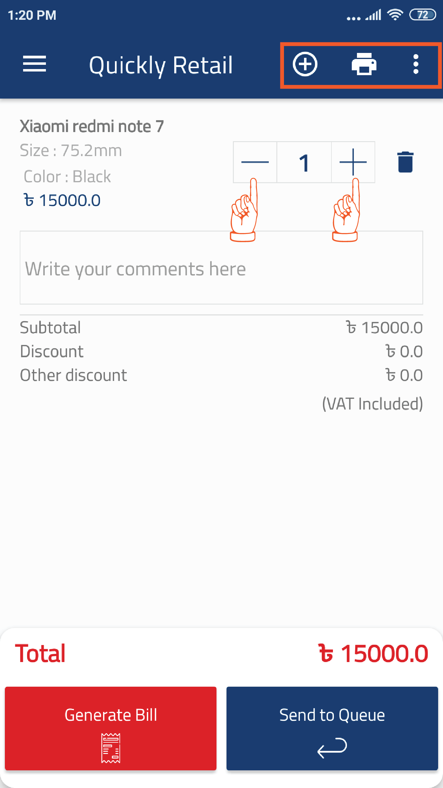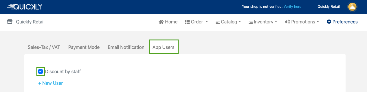 👉 If you click ‘discount by staff’ from the merchant portal, staff will get access to give discounts to preferred customers in-app. Discount will be applied if your staff member clicks the “Apply Discount” from the header of the app. After clicking on the ‘Apply Discount’ button, where a pop-up window will appear and your staff member needs to write down the amount he wants and click the apply button.