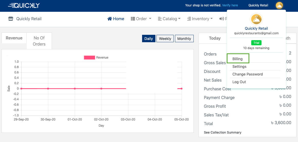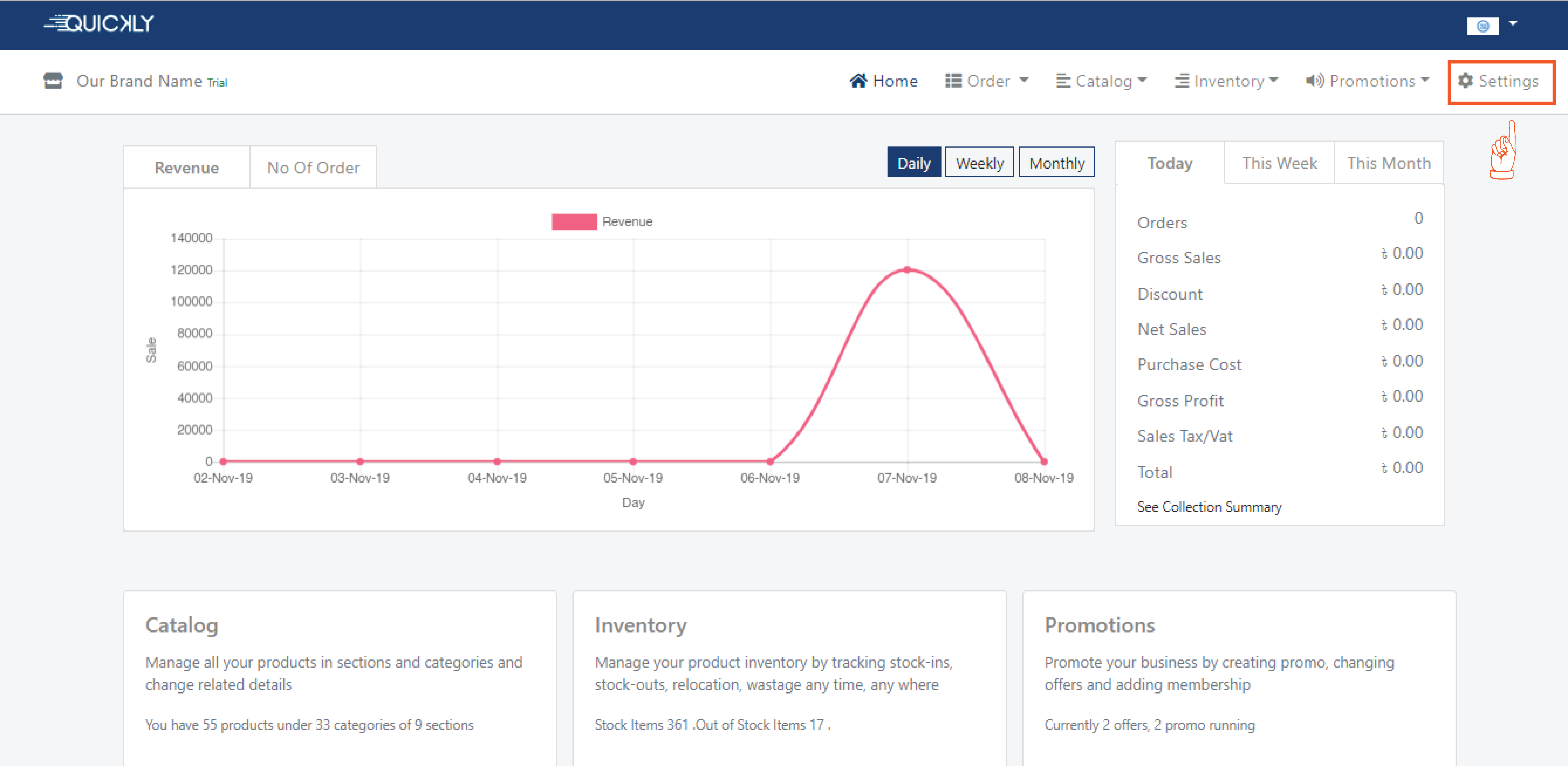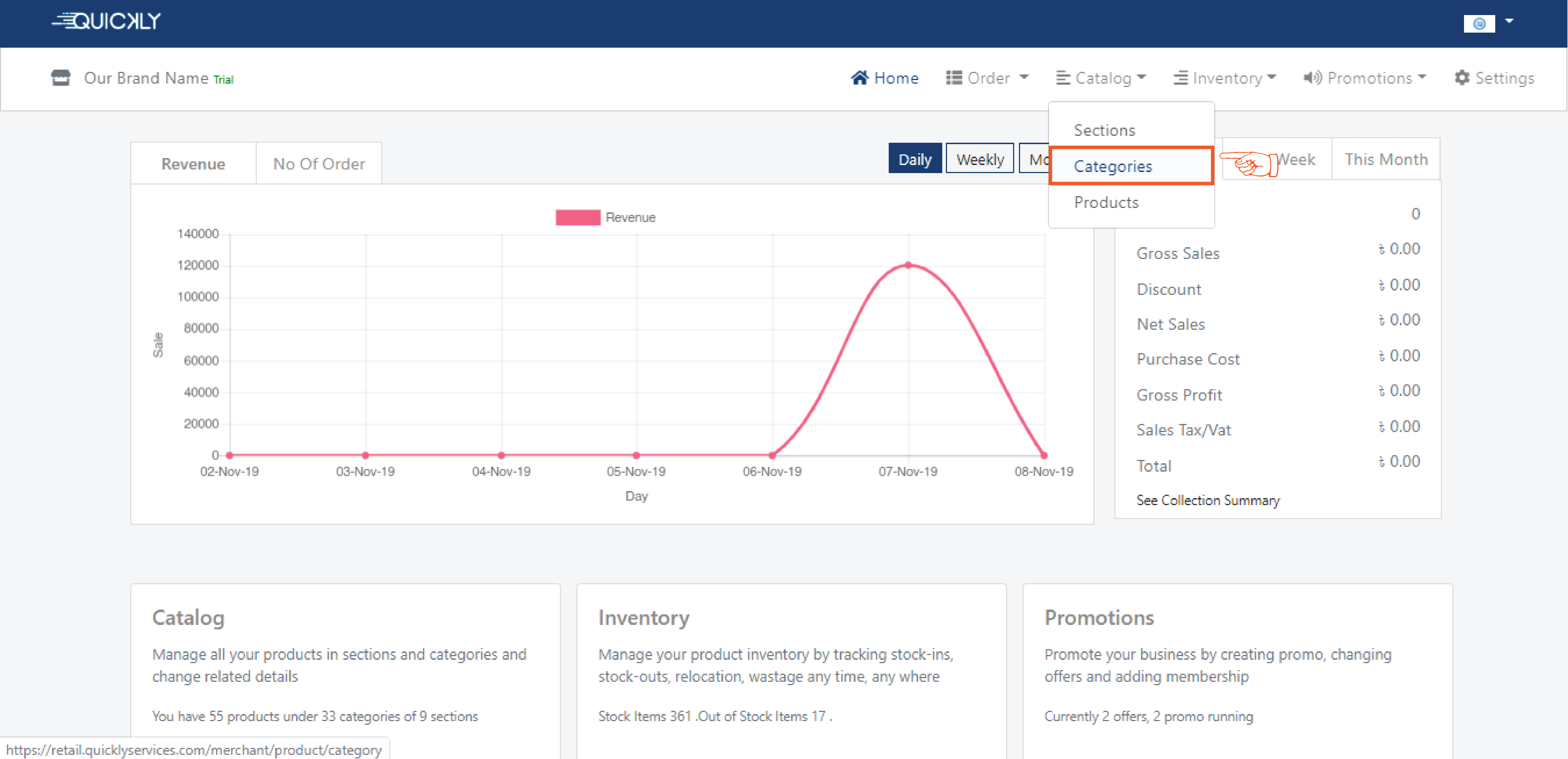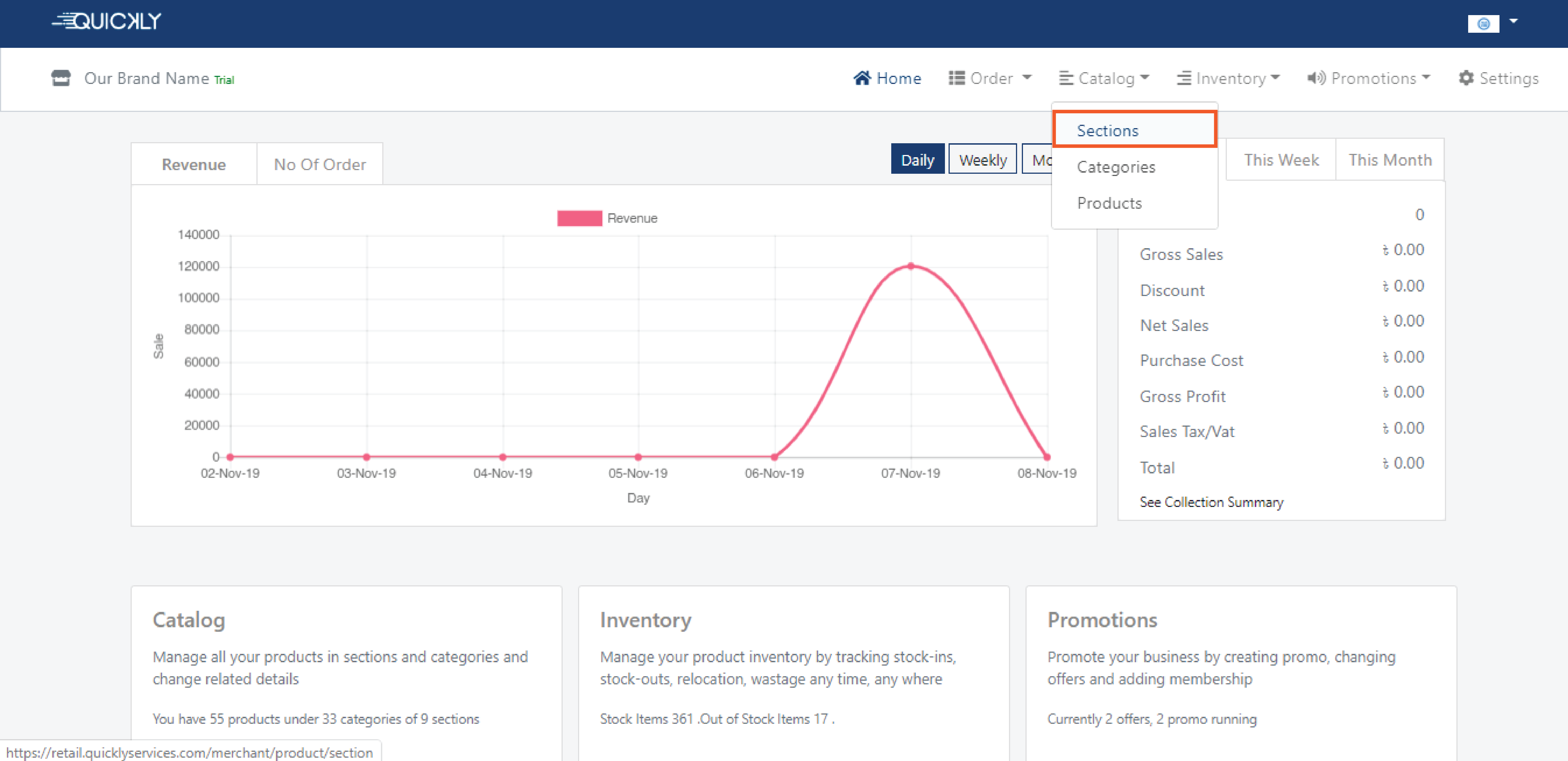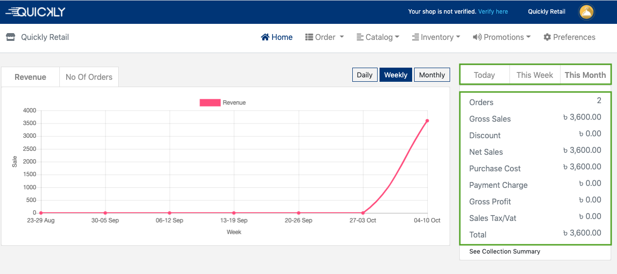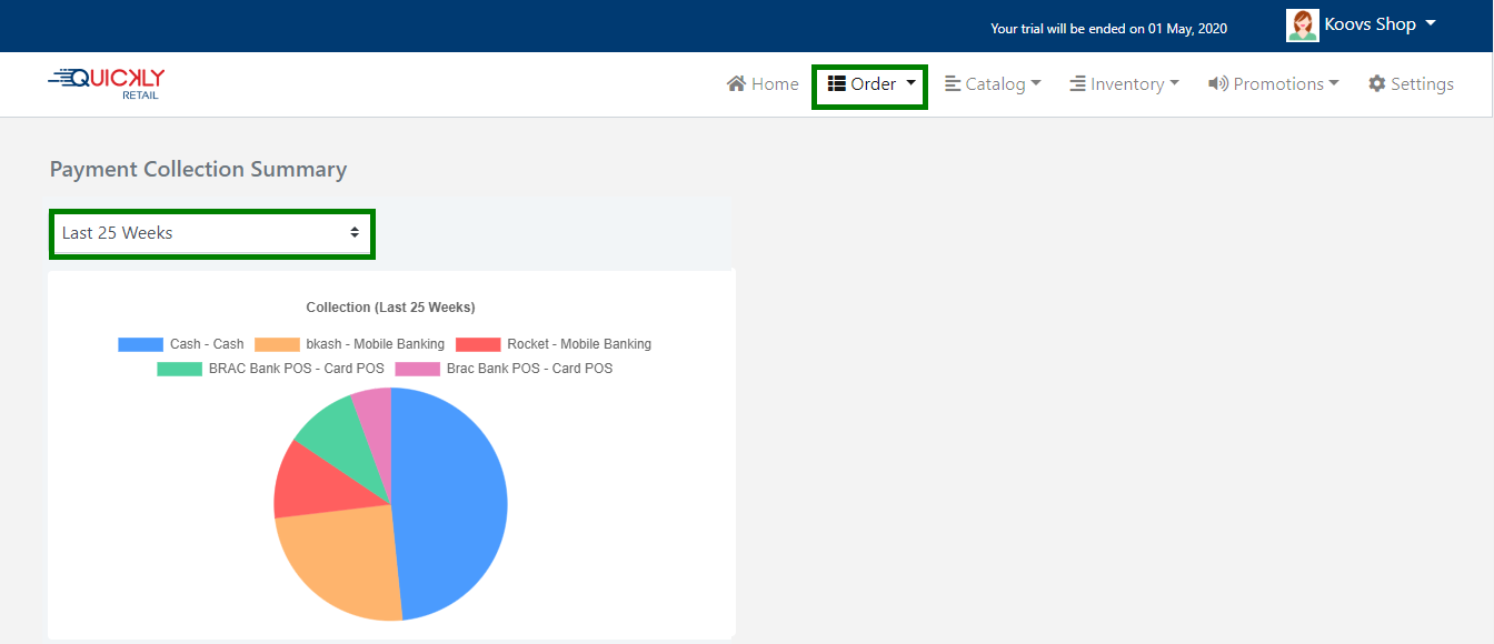 You will find the total collection summary from the right column of the Quickly RetailGo dashboard. The collection summary can be filtered by date (today/this week/this month).