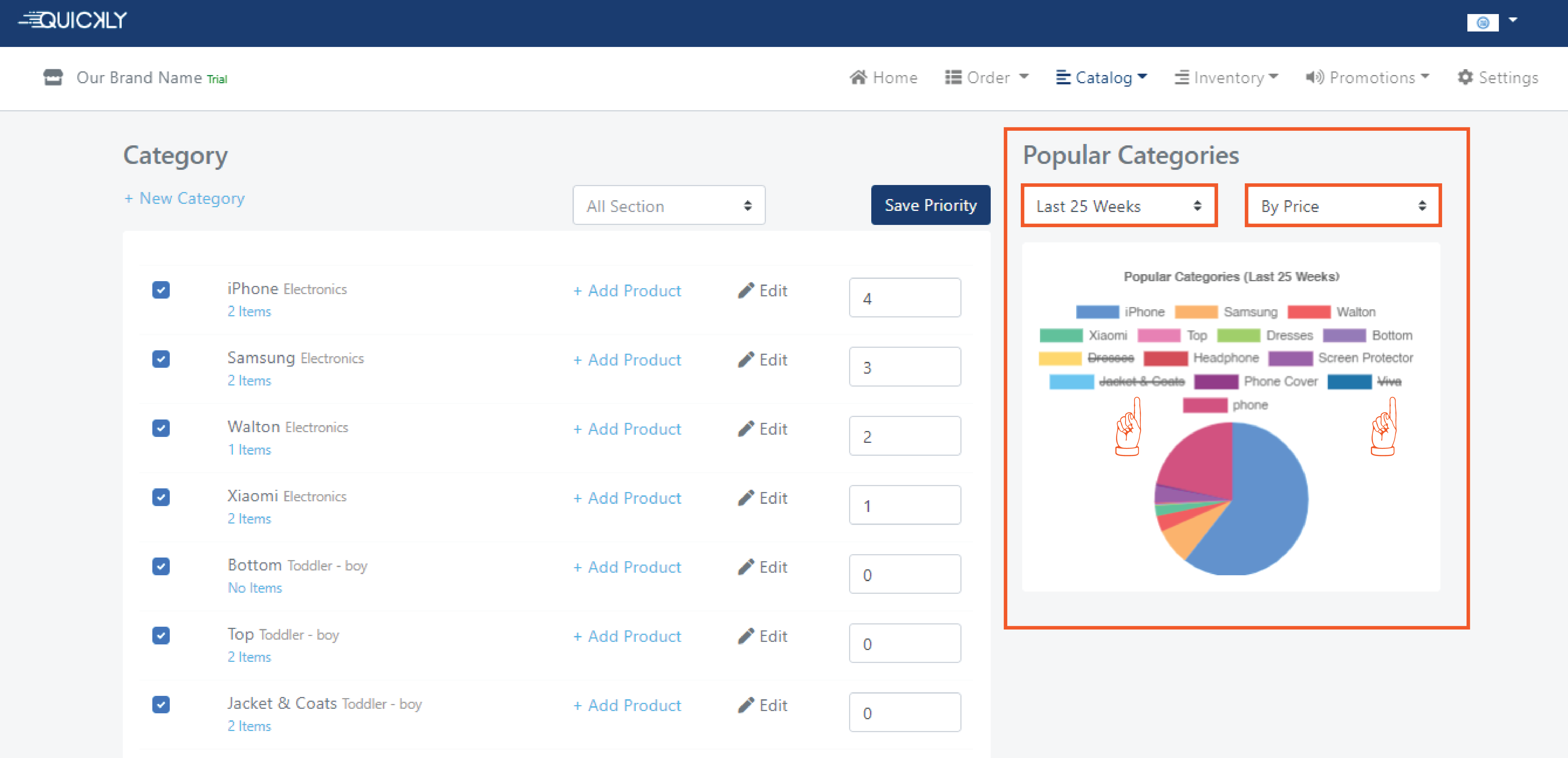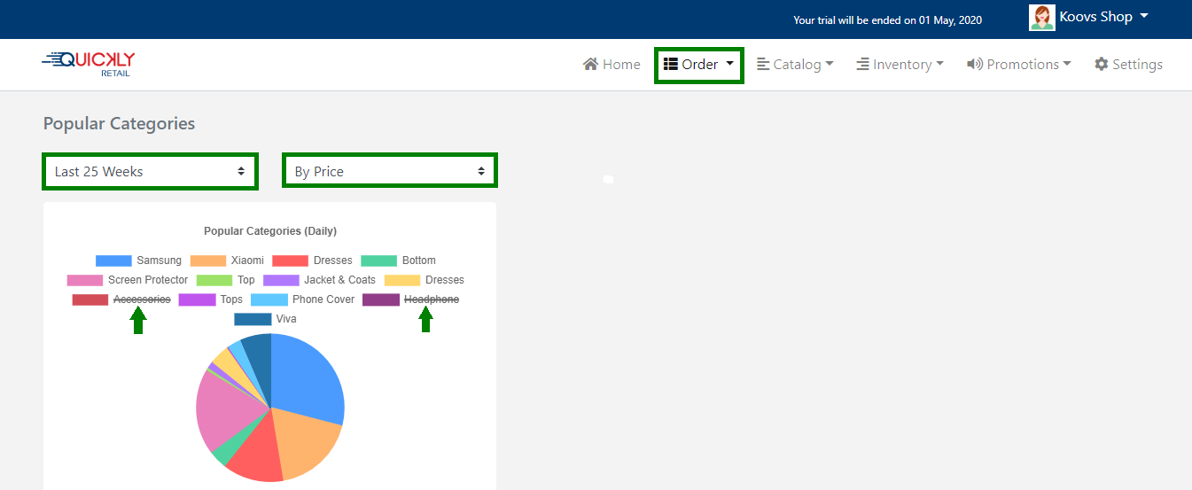 👉 On the right side of this page, you can see a handy pie chart indicating the popular categories of your shop according to time, quantity and sales. You can also eliminate one or more categories by clicking on the category names and the pie chart will show data excluding information of those categories.