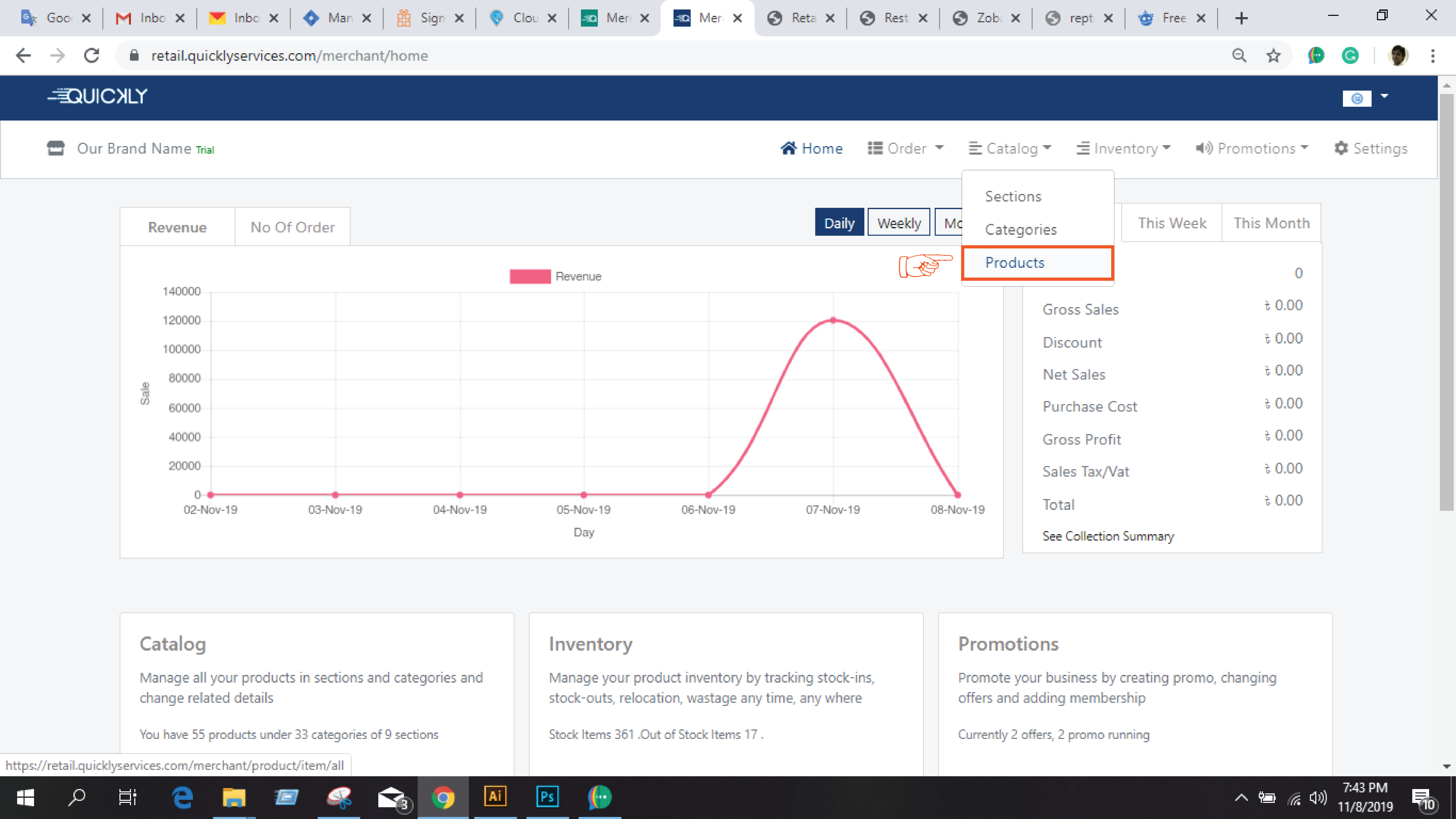 👉 To create a product, simply navigate to the Catalog option of the portal and click on the Products.