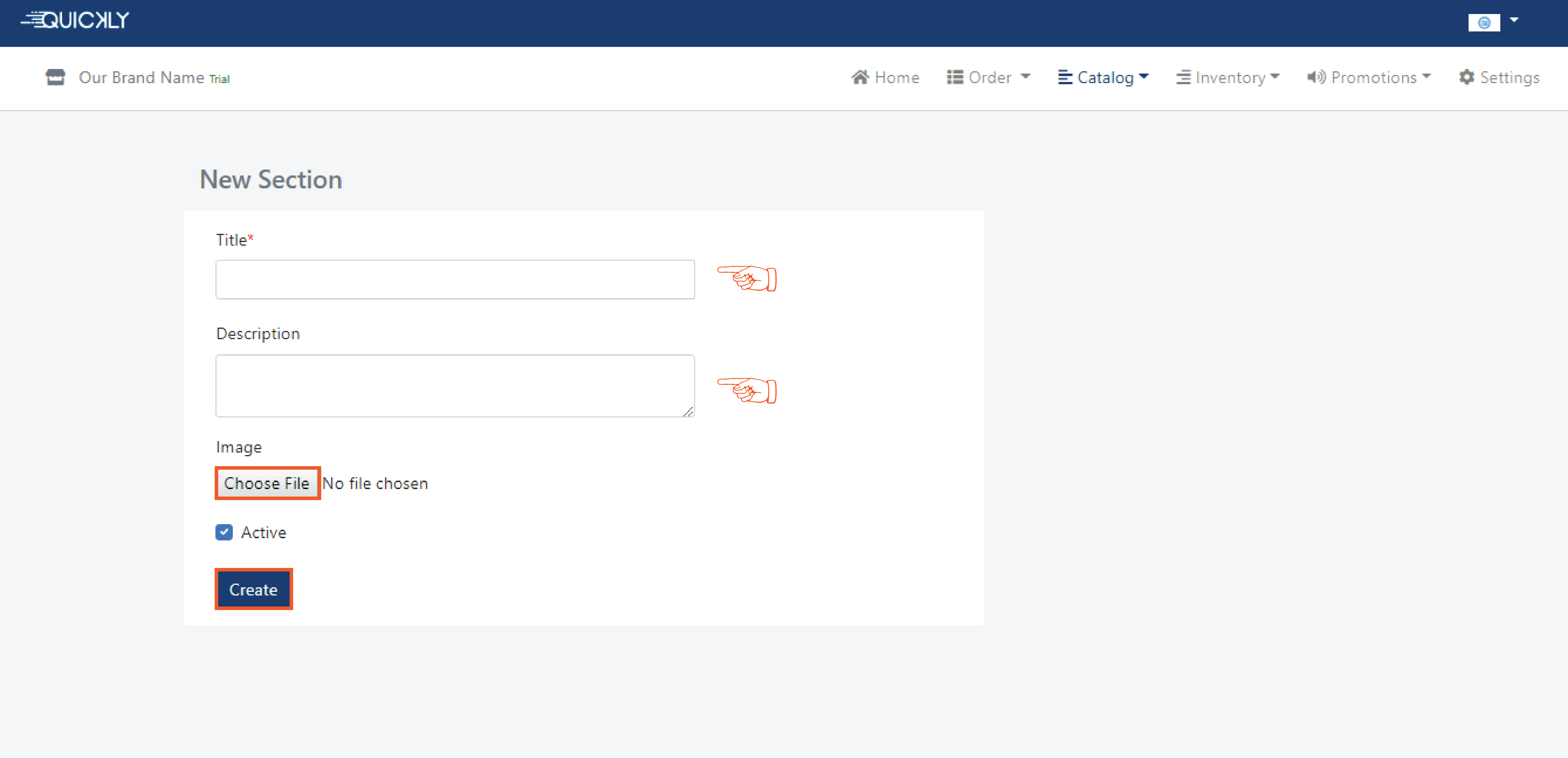 👉 Simply write down the name of your section (i.e Electronics) in the title and put a little description if you want to. You can also upload an image of your section. Check the active checkbox and click on the create button.