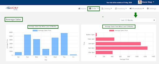 Day wise Average sale and Time wise Average sale can be seen in charts of the last 4 weeks, 12 weeks, and 25 weeks.