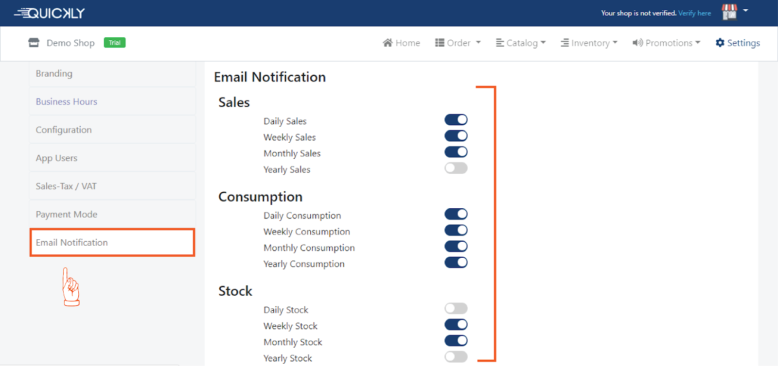 👉 To help you trace your business’s data in a more convenient way we will send you the daily, weekly and/or monthly stock, consumption and/or sales reports to your mailbox. Simply go to the email notification page and select the reports you want to get via email.