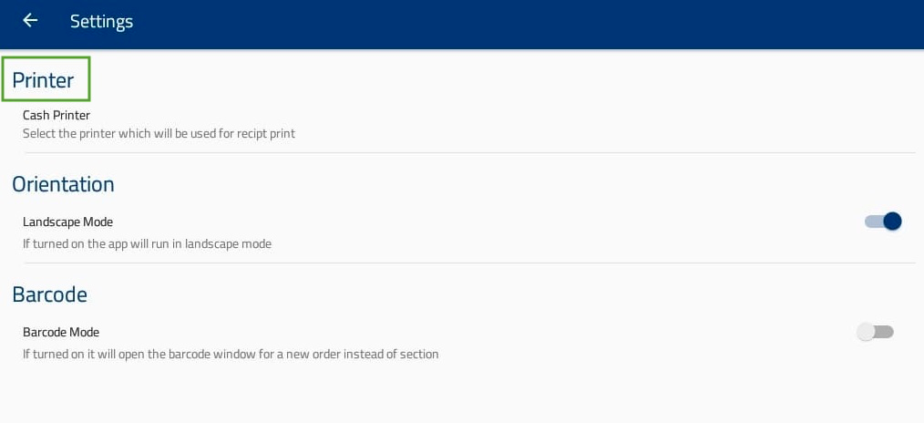 👉 To pair your device with your printer, click on the sidebar of the app and go to settings. You will see printer options named as cash printer.