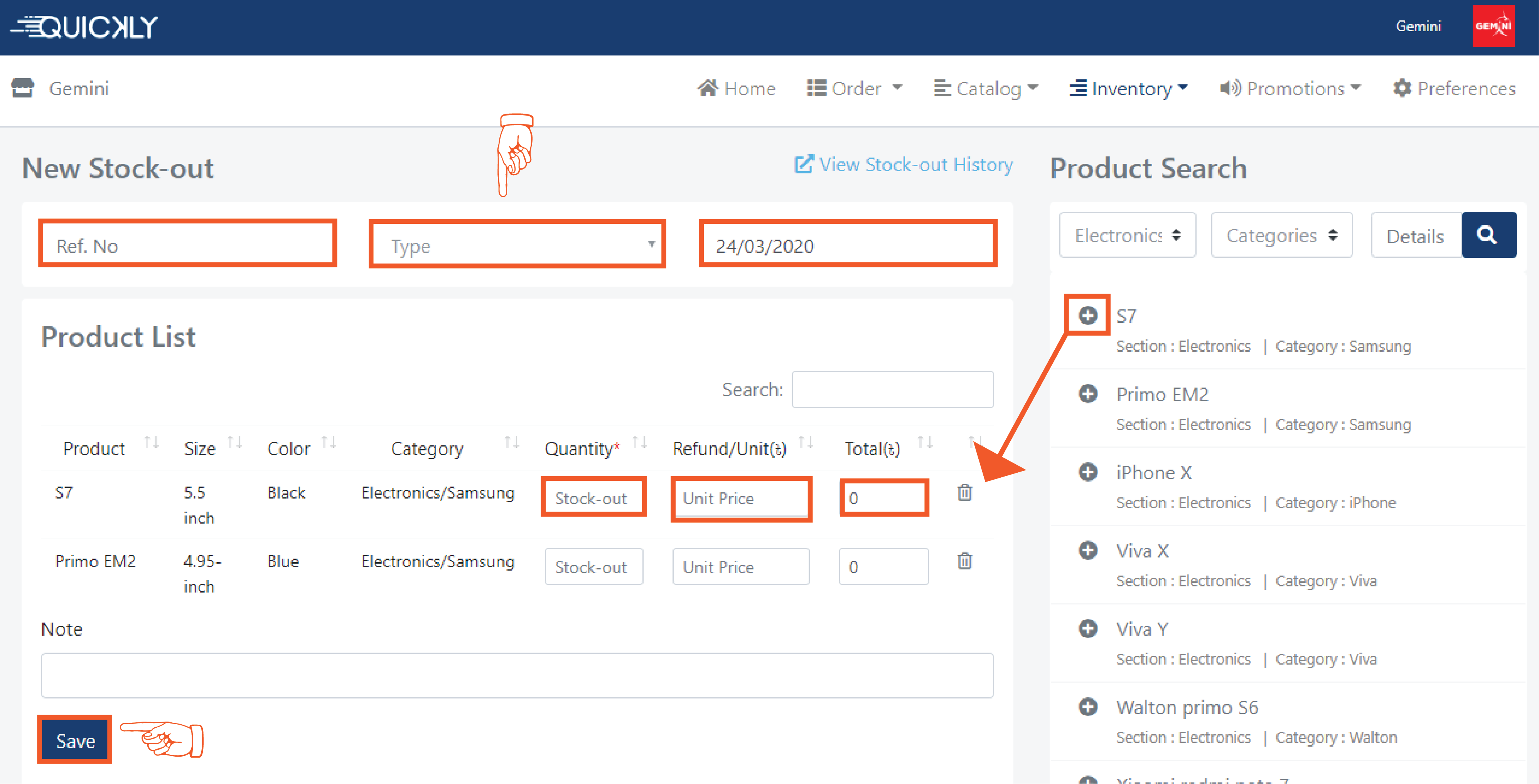 On the New Stock-out page, write down a Ref. no. you can write any code