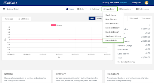 Simply select Barcode Print from the Inventory dropdown menu which will bring up a page to add products for printing barcode.