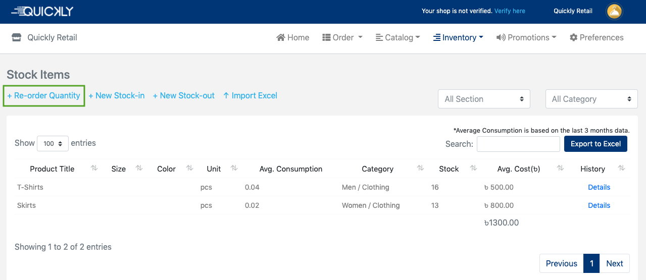 Click on +Re-order Quantity from the Stock Items page and a form will appear.
