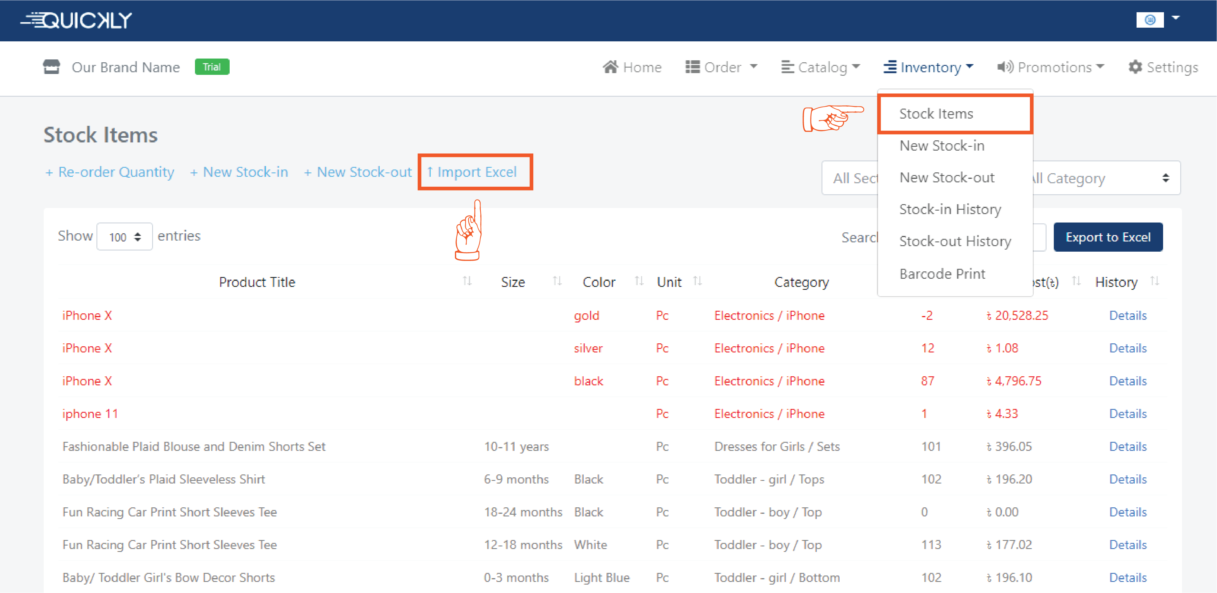 👉 Don’t want to stock items manually in the software? Or you already have your stock items in an excel sheet? Then go to the stock item page and you can simply upload that excel file [Following a specific format click here]. Click on the import excel button and upload the file. the software will automatically generate the information.